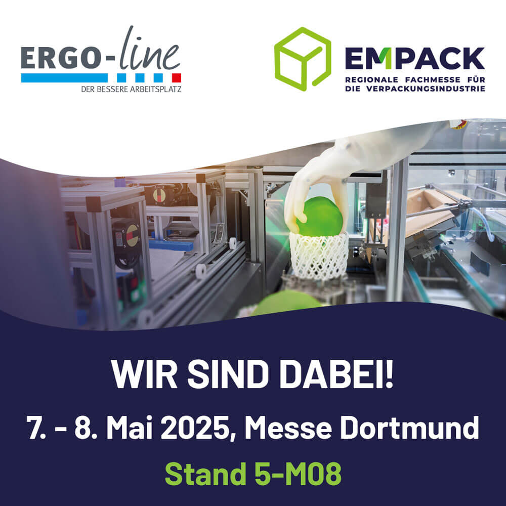 Erleben Sie ERGO-line live auf der EMPACK Dortmund! Unsere Experten präsentieren Ihnen vor Ort verschiedene Arbeitsplatzmodelle, innovative Zusatzkomponenten und praktische Zubehörteile. Lassen Sie sich beraten und finden Sie die optimale Lösung für Ihre Verpackungsprozesse.